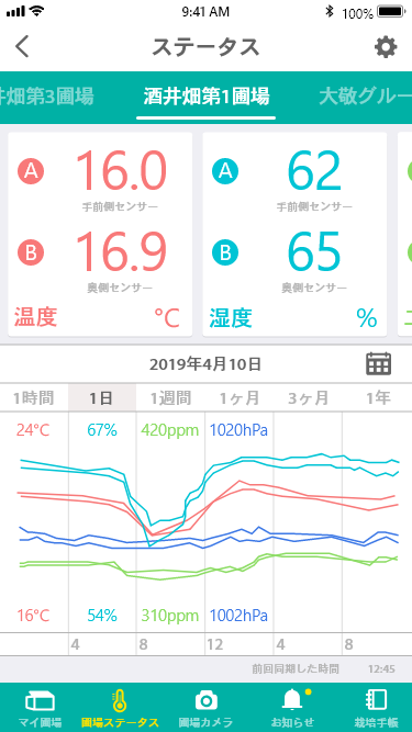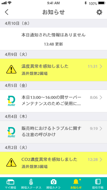 Dnoteシステムは取得した数値に対し、アラート制御数値を設けることによってあなたの圃場を守ります。温度や湿度、CO2などの異常数値を素早く察知し、あなたへとお知らせします。