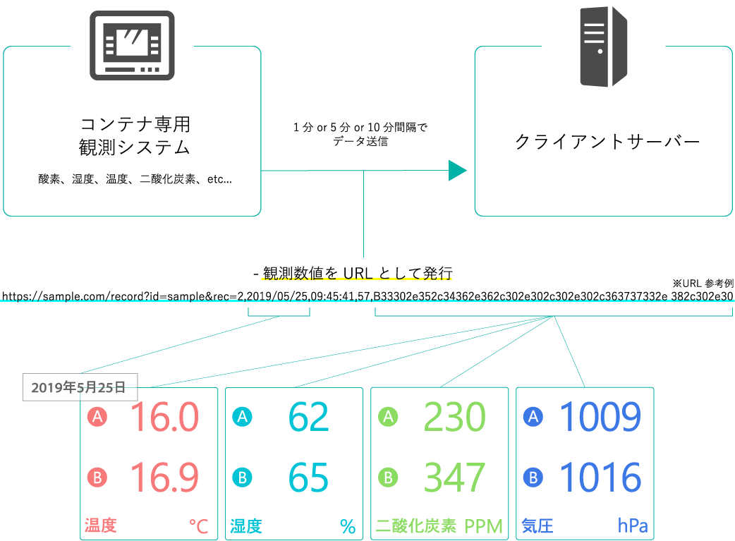 コンテナ専用観測システムでは各コンテナから数値を取得し、その数値をURLとして各クライアントサーバーへ送ります。その数値を使って各クライアントは独自のシステムと結合してありとあらゆる自動化・分析の手助けとなります。